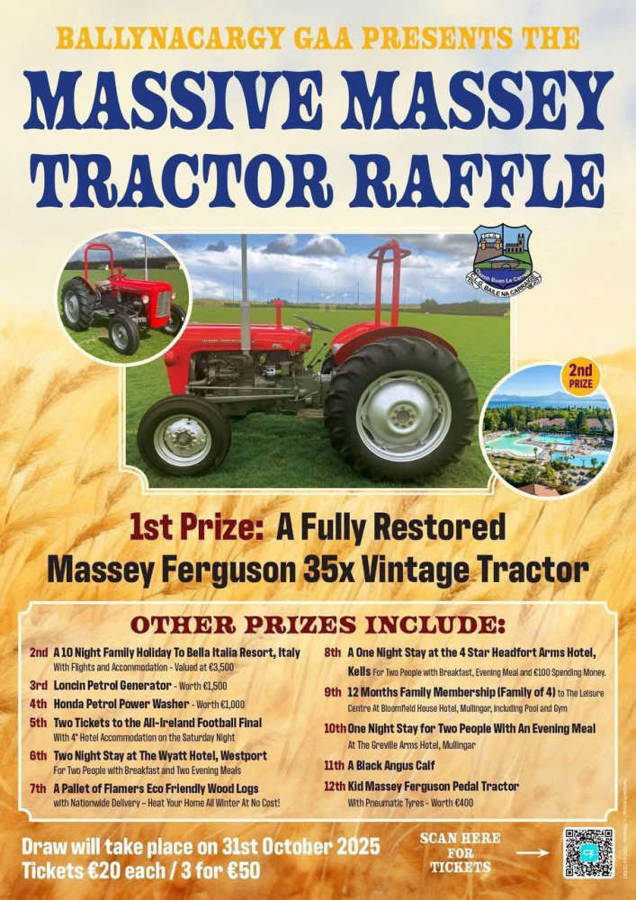 The Ballynacargy GAA “Massive Massey” Fundraising Raffle in the Bridge Centre, Tullamore on 23rd, 24th and 25th October. Win a fully restored Massey Ferguson 35x vintage tractor as the 1st prize + a family holiday in Italy, All-Ireland final tickets, Hotel breaks & loads more up for grabs. The Massey Ferguson 35x will be in the Bridge Centre for all to see so come and check it out. Tickets also available from Ballynacargy GAA Facebook page.