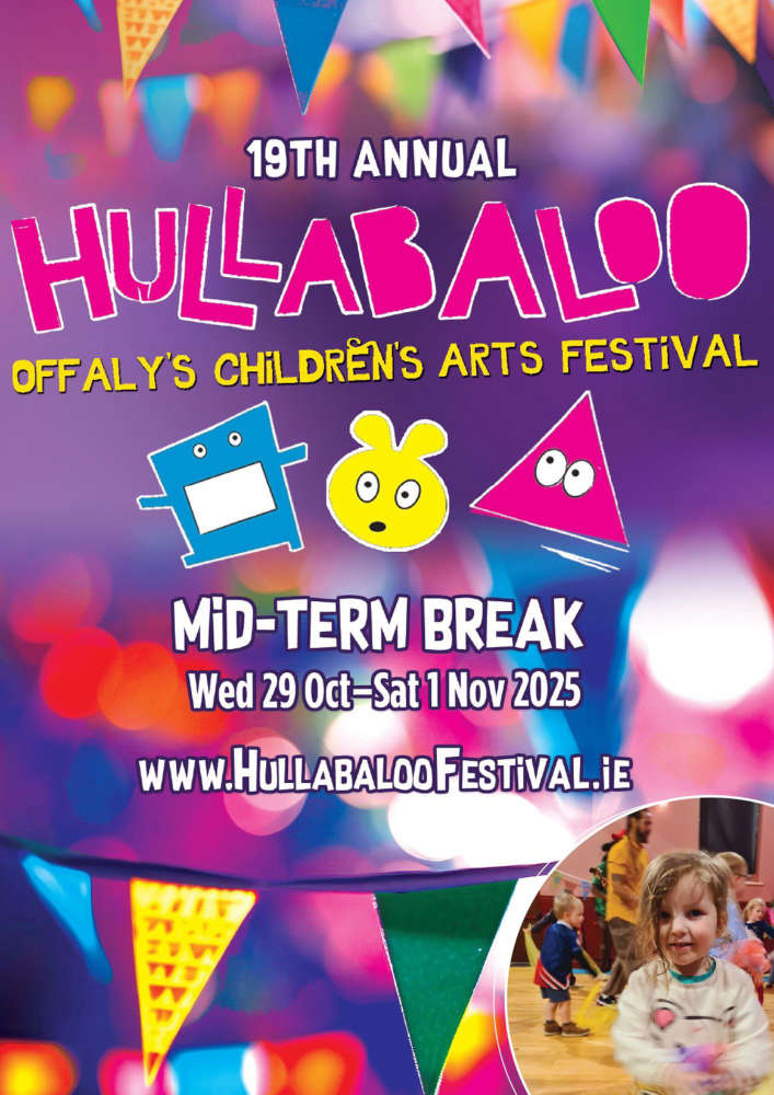 From Wednesday, October 29th to Saturday, November 1st, we're bringing over 90 brilliant events to spark imagination and inspire young minds. Join us for art, drama, dance, crafts, and family performances! We’re filling five towns with fun: Birr, Clara, Edenderry, Tullamore, and Kilcormac! It’s non-stop creativity for children under 12. Tickets are going fast! Don't miss out on the best Mid-term artistic fun in the Midlands! Search for Hullabaloo Festival to see the full programme and book today!" -