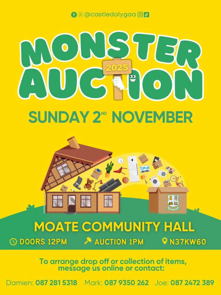 Castledaly GAA Club’s Monster Auction – Sunday November 2nd in Moate Community Centre. It plans to be a fantastic day filled with exciting auction items, including furniture, electronics, gift vouchers, and much more. 𝗗𝗼𝗻𝗮𝘁𝗶𝗼𝗻 𝗼𝗳 𝗶𝘁𝗲𝗺𝘀 𝗳𝗼𝗿 𝘁𝗵𝗲 𝗮𝘂𝗰𝘁𝗶𝗼𝗻 𝗮𝗿𝗲 𝗮𝗹𝘀𝗼 𝘄𝗲𝗹𝗰𝗼𝗺𝗲. 𝐃𝐨𝐨𝐫𝐬 open 𝟏𝟐𝐩𝐦 | 𝐀𝐮𝐜𝐭𝐢𝐨𝐧 𝟏𝐩𝐦