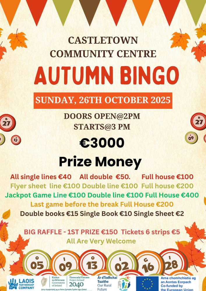Castletown Bingo- Sunday 26th October – Door’s Open 2p.m. Start 3p.m. €3,000 in prize money with a Big Raffle on the day.
