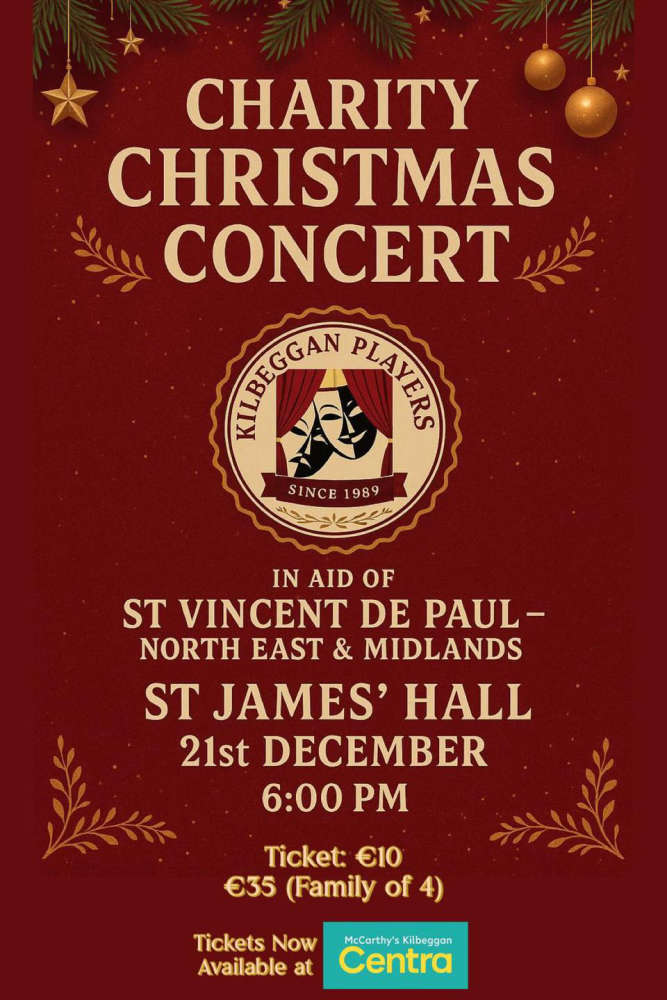 KILBEGGAN PLAYERS CHRISTMAS CONCERTKilbeggan Players Drama Society Charity Christmas Concert takes place on Sunday 21st December at 6pm in St. James’ Hall, Kilbeggan. In ai of St. Vincent De Paul – North East and Midlands. Tickets from Centra Kilbeggan.