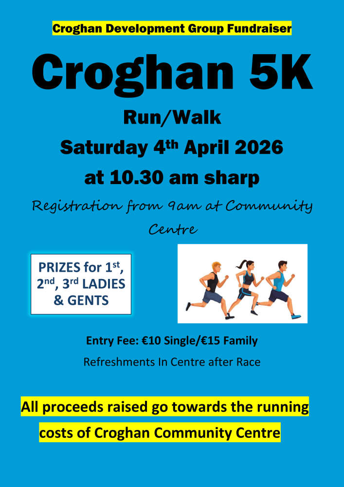 CROGHAN ANNUAL 5K EASTER RUNCroghan Development Group will host their annual 5k fun run on Easter Saturday, April 4th. Parking and registration will be at Croghan Community Centre from 9am with race starting at 10.30am sharp. Entry fee €10 for single entry, €15 for a family. Refreshments in the Centre after race. All proceeds will go towards Croghan Development Group